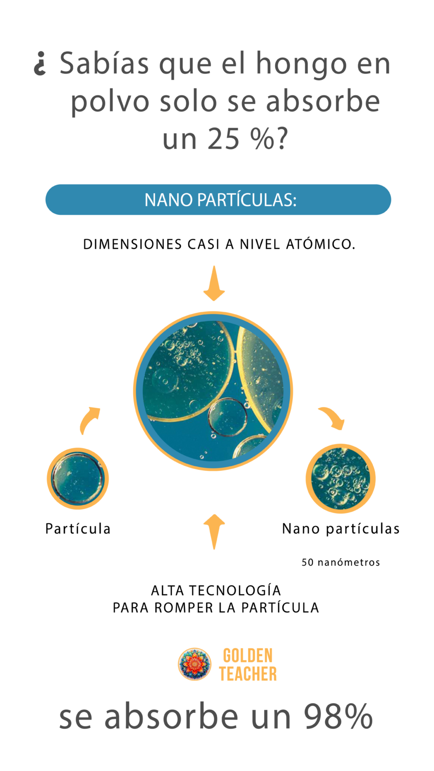 • Nanoestructurado (Golden Adaptógenos): nuestros hongos pasan por un proceso de extracción avanzada y luego se transforman en una emulsión líquida con partículas nanométricas.