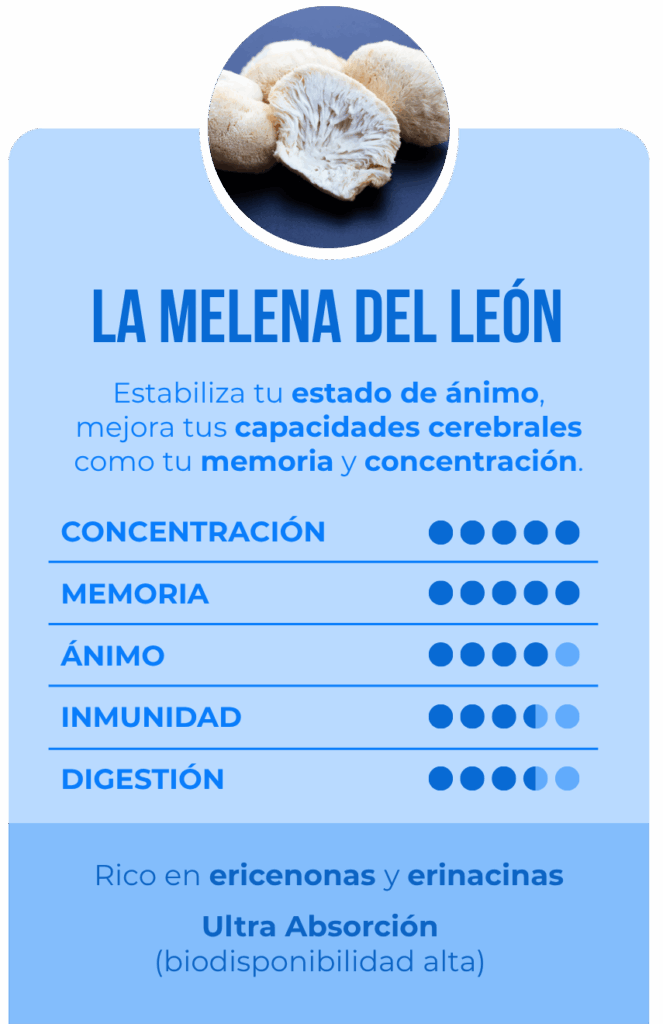 Nano Melena de León es un suplemento diseñado para optimizar la salud del sistema nervioso y cognitivo. Formulado con extractos nanoestructurados de Hericium erinaceus, ofrece beneficios excepcionales en términos de regeneración neuronal y bienestar cerebral.
