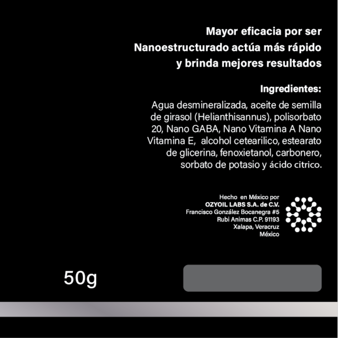 - Nano GABA: Sustancia que favorece la regeneración celular al estimular la síntesis de ácido hialurónico. Sus propiedades calmantes reducen las contracciones musculares faciales, disminuyendo líneas finas y arrugas, logrando una tez más suave y juvenil.